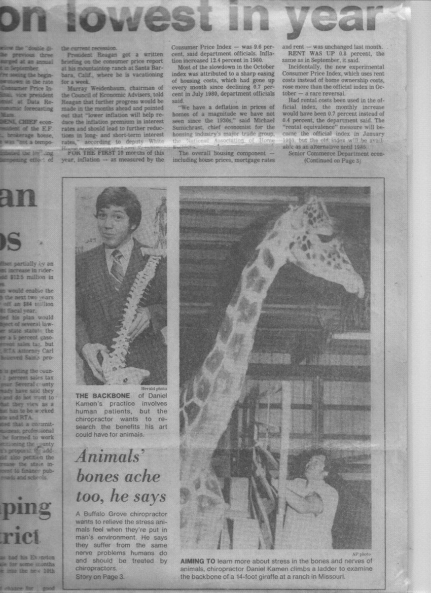 Hey, I wanted to let our listeners know that all of the episodes — including this one — are transcripted, and we have those available in our Show Notes on our SpinalColumnRadio.com website. If you don’t see them — when you go to the Show Notes — look for the word “Transcript” at the bottom and then click the “more” link. And as a little enticement to go check themout today, I’m going to put [in the transcript section], kind of, a “bonus picture” that Dr. Kamen sent me. He dug through his scrapbook and found a 1981 newspaper clipping of a very young looking Dr. Kamen adjusting a very tall giraffee. So go check that out.