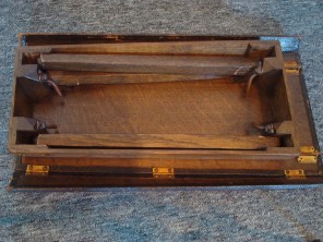 One table is slanted upwards and has collapsing sides. This is table is for the upper body. I am not sure if the patient was supposed to kneel on the floor for adjustments on this table, or if patients used both tables to support the whole body. (See photo of young David Palmer adjusting his childhood friend on the Adams Suit Case table at the top of this post). Or, perhaps, the other table was to be used as an office table for setting objects on. These tables are surprisingly sturdy yet elegant. They collapse back into a suitcase simply by folding the legs and laying the top half on the bottom. Dr Simmons P.C. stated that this table is even better made than the suitcase tables made today, however, the Adams wouldn’t be comfortable for a patient [despite what the ads says].