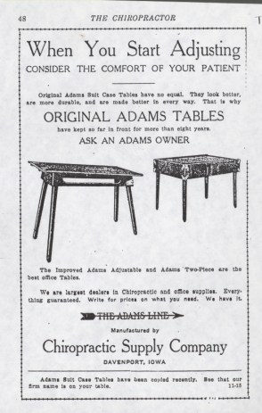 The Adams table was produced by the “Suit Case Factory” in Davenport, IA from 1905-1916. B.J. Palmer, knowing there was an overwhelming need to deliver Chiropractic to the world at large, had patented this table along with others.