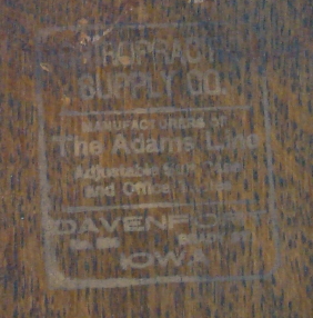 Note: Underneath the table, the manufacture trademark states “Chiropractic Supply Co. Manufactures of The Adams Line Adjustable Suit Case and Office Tables. Davenport Iowa Brady St.” There is a patent number which I would be interested in reading, but currently it is obscured by some gummed paper residue.