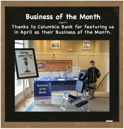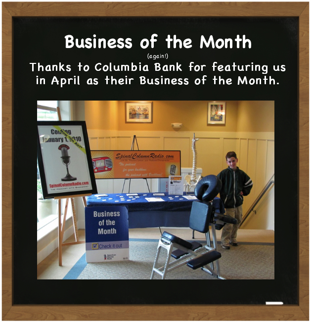 In April of 2010, our neighborhood Columbia Bank, showcased us with our SpinalColumnRadio as their “Business of the Month.” This is what we posted on our Practice Chalkboard: