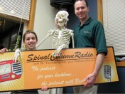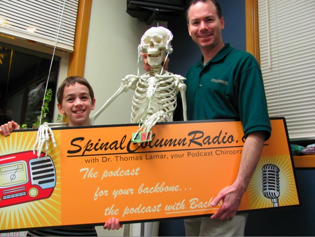 Dr. Lamar and son, Logan, (with Mr. Bones in the middle) hold up the Spinal Column Radio website header.